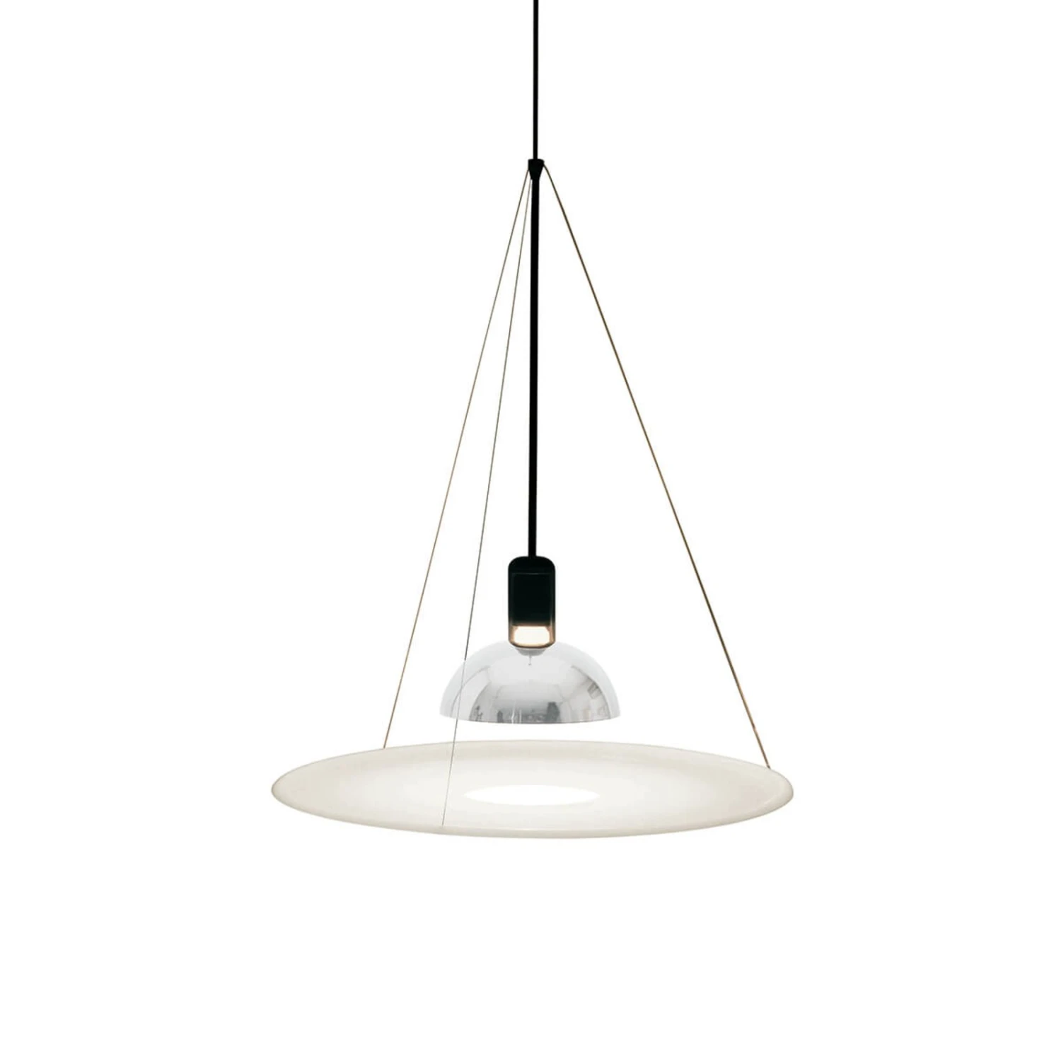 Geschrieben wird es zwar ein wenig anders, aber dass der Name FRISBI bei dieser Hängeleuchte in Anlehnung an das bekannte Wurfflugspiel entstanden ist, kann man sich gut vorstellen, denn die Scheibe aus PMMA hängt an kaum sichtbaren Drahtseilen und scheint deshalb ein bisschen in der Luft zu fliegen – eben genauso wie der Frisbee. Durch die Verwendung einer relativ leuchtstarken Glühlampe oder einer entsprechenden Energiesparlampe kann die Hängeleuchte von FLOS ideal über einem Esstisch platziert werden.