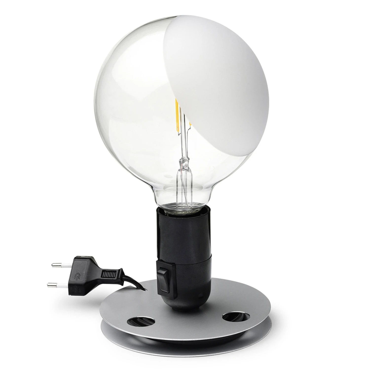 „Weniger ist mehr“ – Dieses Motto schwebte sicherlich auch Achille Castiglioni vor, als er diese originelle Tischleuchte Lampadina entwarf. Reduziert auf das Wesentliche, mangelt es Lampadina dennoch nicht an dem gewissen Extra. Das Hauptaugenmerk liegt auf dem außergewöhnlichen Globe-Leuchtmittel, das durch seine besondere Optik ins Auge fällt. Eine kreisrunde Fläche auf einer Seite des Leuchtmittels wurde milchig satiniert, der übrige Teil ist transparent. Dank dieses einzigartigen Leuchtmittels erzielt die Tischleuchte Lampadina einen tollen, zweiteiligen Lichteffekt. Die satinierte Fläche sorgt für eine homogene Lichtverteilung zu einer Seite, auf der anderen Seite ist das Innere des Leuchtmittels und damit die Lichtquelle direkt sichtbar. Der Fuß der Leuchte wurde in einem minimalistischen, fast schon industriell anmutenden Stil gehalten, um nicht vom Herzstück abzulenken. Im Entfernten erinnert das untere Element des Fußes an eine Filmspule aus alten Zeiten. Diese beherbergt das 230 cm lange Kabel, das dank dieser praktischen Aufbewahrungsmöglichkeit niemals im Weg ist.