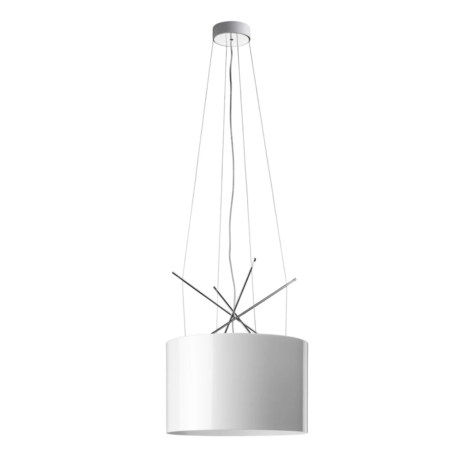 Die von Rodolfo Dordoni designte Hängeleuchte Ray S kommt im Wesentlichen ohne besondere Details aus: Der Schirm besteht aus einem zylindrischen Glas- bzw. Aluminiumring, nur die gekreuzten Metallstreben oberhalb des Schirms stellen eine gewisse Besonderheit dar. Eine zeitlos schöne Hängelampe, die mit ihrer zurückhaltenden, aufs Wesentliche reduzierten Optik in modernen Wohnräumen eine erstklassige Figur macht. Bei einem Durchmesser von 43 cm kann Ray S über einem Tisch angebracht werden oder aber frei im Raum hängen – man denke hier an Flur und Schlafzimmer.