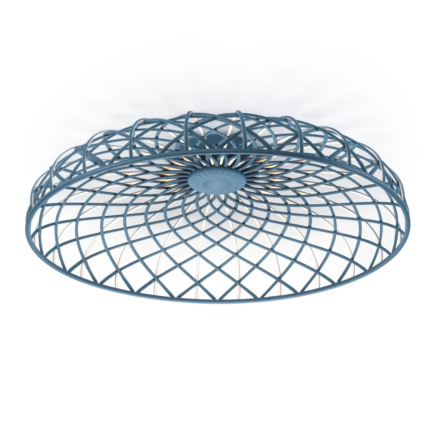 Die in der Form einer Kuppel gestaltete LED-Deckenleuchte Skynest erinnert an einen geflochtenen Korb. Das Gestell aus Aluminium wird mit recyceltem Polyester verkleidet. Ein Teil der Streben ist vollständig ummantelt, während jede zweite Strebe mit einem LED-Streifen ausgestattet ist, der das warmweiße Licht ausschließlich nach innen abgibt. Es entsteht ein schöner Kontrast und eine glamouröse Lichtwirkung.