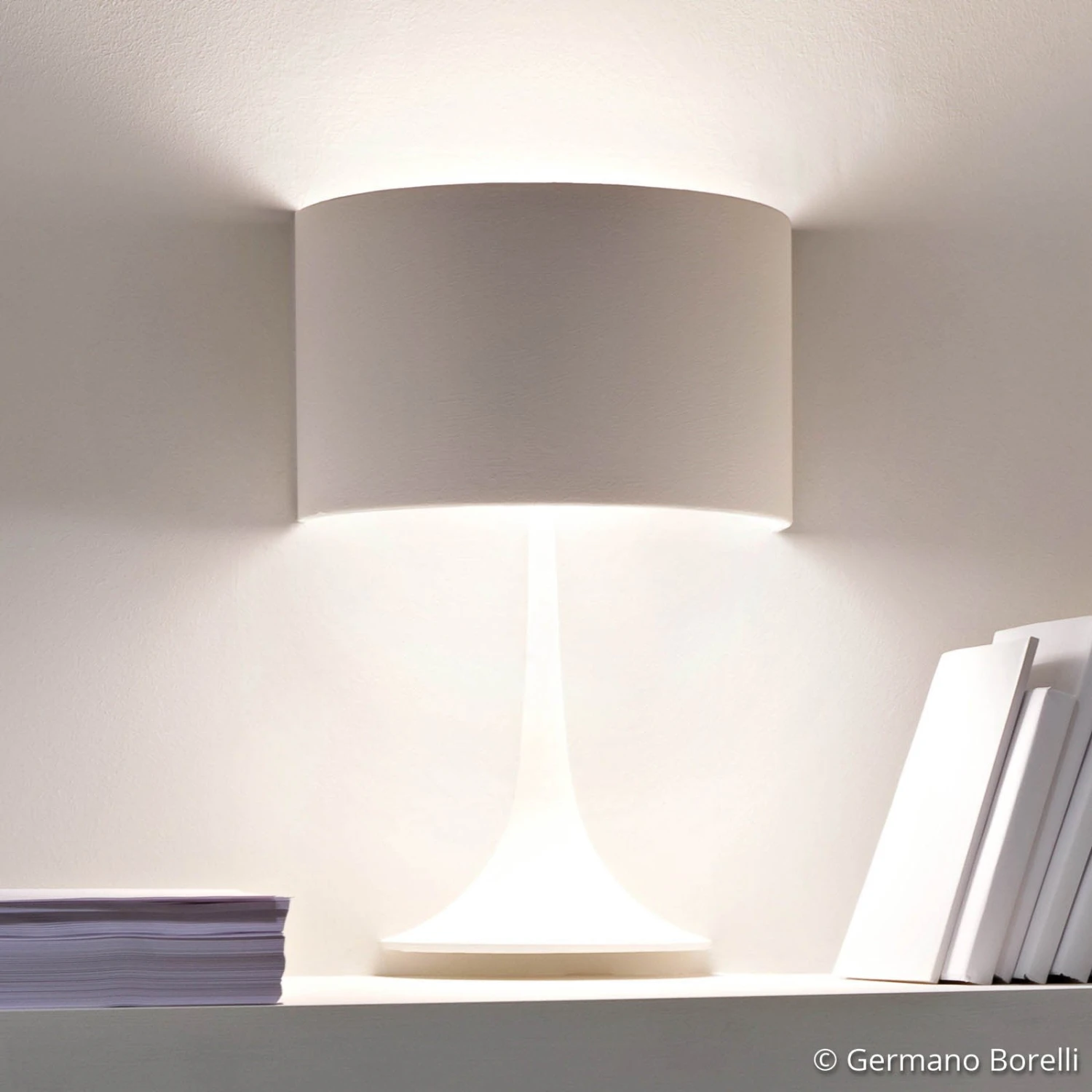 Auf den ersten Blick sieht die Leuchte Soft Spun Small wie eine ganz normale Tischleuchte aus – klassisches, puristisches Design und deswegen nicht besonders auffällig. Doch schaut man genauer hin, sieht man, dass es eigentlich nur eine halbe Tischleuchte ist, die noch dazu nicht auf dem Tisch oder der Kommode steht, sondern darüber zu schweben scheint. Schweben kann sie nur deshalb, weil sie eigentlich eine Wandleuchte bzw. eine Einbauleuchte ist, die halb in die Wand eingebaut und halb darauf montiert wird.