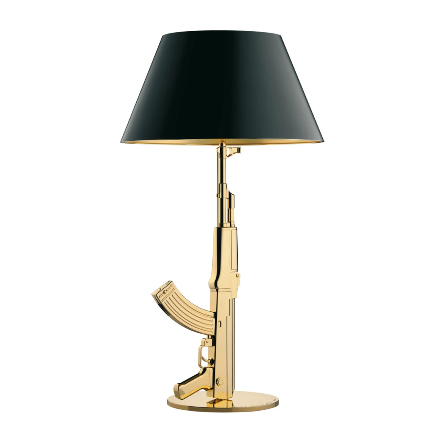 Hervorstechende Tischleuchte TABLE GUN mit sozialkritischer Botschaft, designt von Philippe Starck